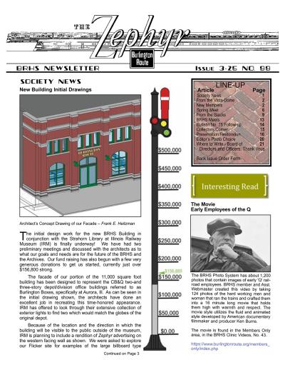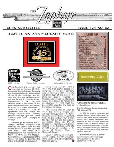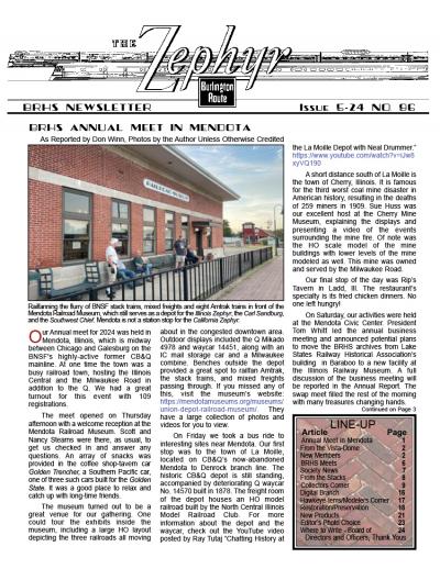 Zephyr #33 (pdf) Sorry, this item is no longer available. "1-96 Rockford, IL Annual Meet recap, 1996 Annual Meet announced for Denver September 20-22, 1996, spring meet will be in LaGrange April 27th, around the system, photo section on Illinois Railway Museum work day and BRHS items, drawing of standard one story section House, photo article on Q layouts, modifying a Kato Q GP-35, new products and books, Q&A, exchange place. 28 pages with 17 photos."