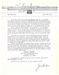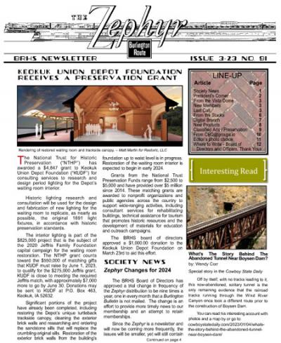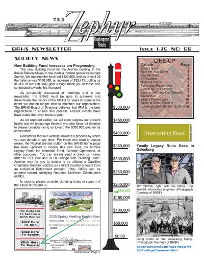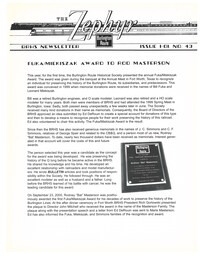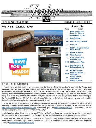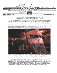 Zephyr #33 (pdf) Sorry, this item is no longer available. "1-96 Rockford, IL Annual Meet recap, 1996 Annual Meet announced for Denver September 20-22, 1996, spring meet will be in LaGrange April 27th, around the system, photo section on Illinois Railway Museum work day and BRHS items, drawing of standard one story section House, photo article on Q layouts, modifying a Kato Q GP-35, new products and books, Q&A, exchange place. 28 pages with 17 photos."