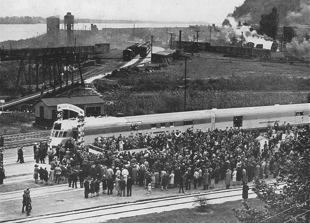 At 2:00 p.m., October 25th, the coast to coast broadcast over CBS began and so did the dedication ceremonies. The honors of christening the new Mark Twain Zephyr fell to Clemens' granddaughter, Nina, also the great-granddaughter of John M. Clemens, a key player in the creation of the Hannibal & St. Joseph Railroad in 1846. The famed "Hannibal & St. Joe," started in Hannibal in 1851 and was completed to St. Joe in 1859, the first railroad to reach the Missouri River, and the first and only railroad to carry the U.S. Mail for transfer to the Pony Express at St. Joseph. This same railroad was one of the earliest predecessors of the railroad that was dedicating it's new Zephyr in Hannibal that day, the Burlington.