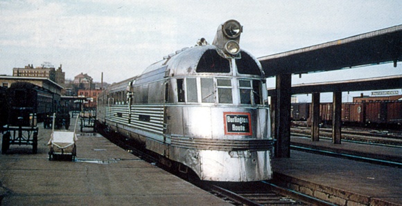 A heavily airbrushed image of the Mark Twain Zephyr as altered for service over the Ozark State Zephyr route between St. Louis and Kansas City via the joint CB&Q/Alton trackage. CB&Q Photo - BRHS Archives.