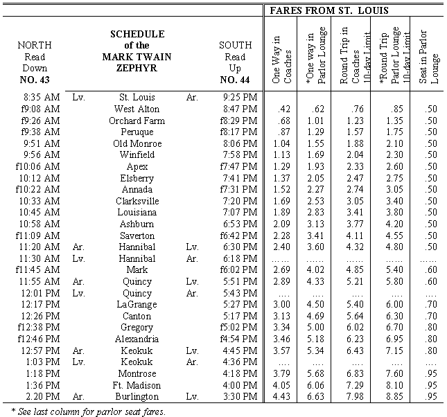 The first regular service trip of the Mark Twain was made from Hannibal to St. Louis on Sunday, October 27th. The scheduled trip for the Mark Twain was a round-trip journey from St. Louis to Burlington, however the railroad thought it appropriate to split the schedule for the first day and begin service at Hannibal. The normal schedule began Monday morning, October 28th at St. Louis. |